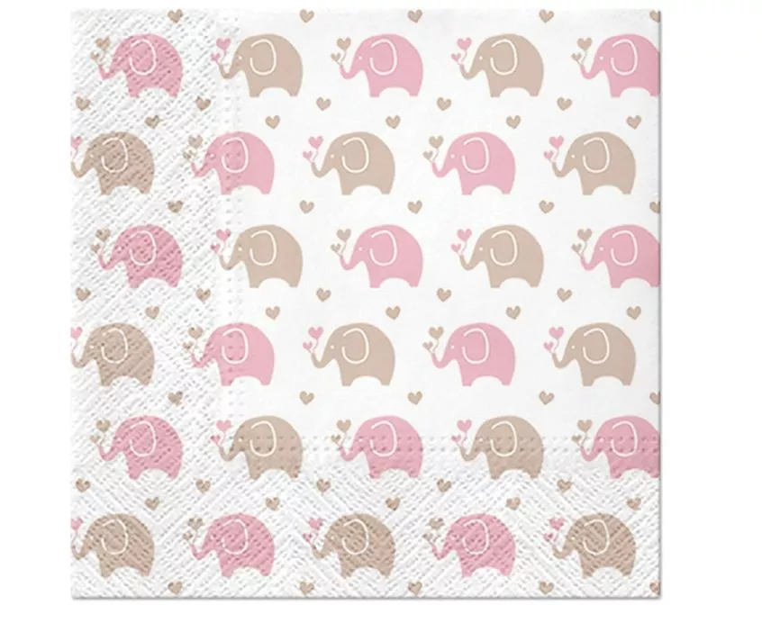 Χαρτοπετσέτες με θέμα Baby Elephant για κοριτσάκι. Ιδανικό σχέδιο για πάρτυ Baby Shower και candy bars βαπτίσεων. • Το πακέτο περιλαμβάνει 20 χαρτοπετσέτες • Διαστάσεις: 33 x 33 cm